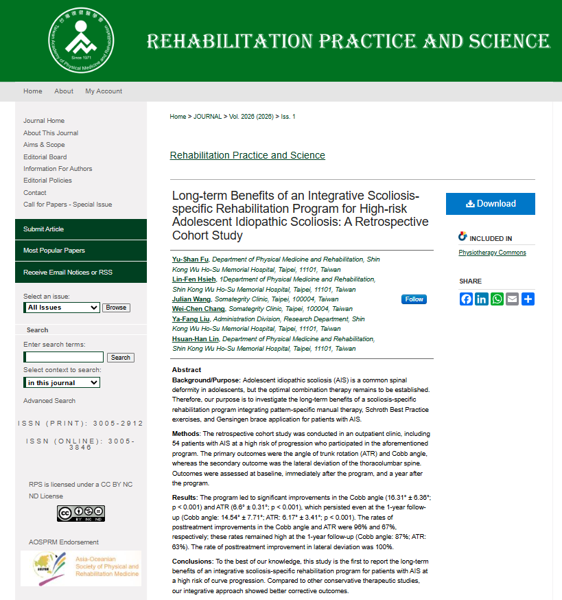 聯手合作的脊椎側彎非手術矯治研究論文,已正式刊登於台灣專業醫學期刊: